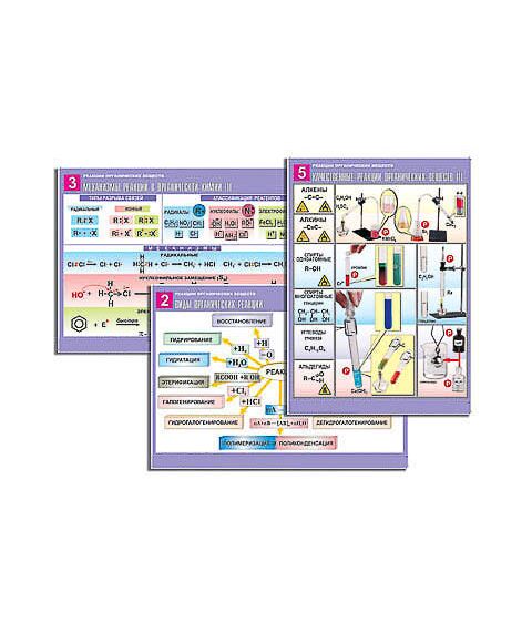 Комплект охватывает следующие темы: "Типы органических реакций", "Виды органических реакций", "Механизмы реакций в органической химии", "Качественные реакции органических веществ".