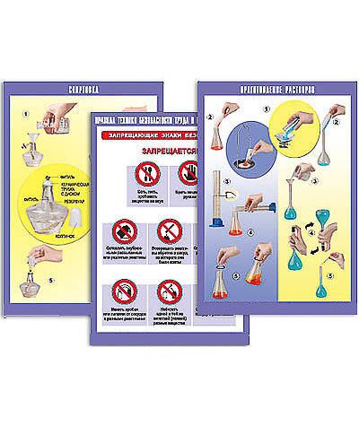 2. Инструктивные таблицы: "Спиртовка", "Электронагреватели", "Приемы обращения с лабораторным штативом", "Обращение с твердыми веществами", "Обращение с жидкими веществами", "Нагревание", "Получение и собирание газов". "Взвешивание", "Приготовление растворов", "Фильтрование", "Перегонка", "Титрование".