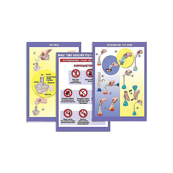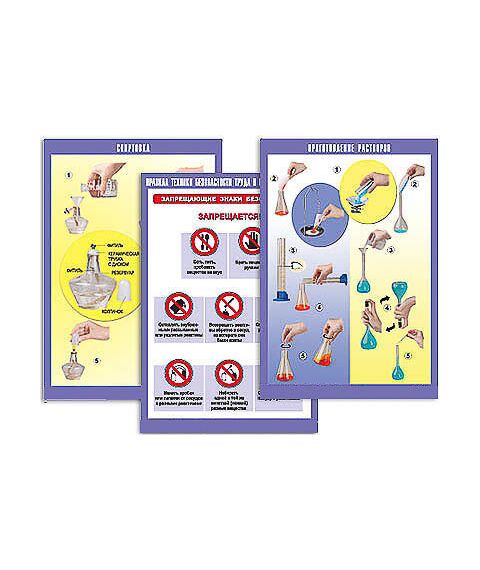 3. Таблицы, знакомящие с правилами безопасной работы в кабинете химии: "Правила техники безопасности труда в кабинете химии (1)", "Правила техники безопасности труда в кабинете химии (2)", "Правила техники безопасности труда в кабинете химии (3)".