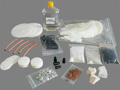 Комплектность: алюминий гранулированный - 0,05 кг, кальция карбид - 0,05 кг, кальция карбонат (мраморная крошка) - 0,5 кг, крахмал картофельный - 0,05 кг, медь - 0,05 кг, парафин - 0,5 кг, уголь активированный - 0,05 кг, горючее для спиртовок - 0,66 л, пробки резиновые - 15 шт., трубки резиновые - 5 шт., фильтры Ø 5,5 см (уп.) - 2 шт., фильтры Ø 12,5 см (уп.) - 1 шт.