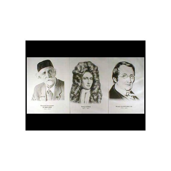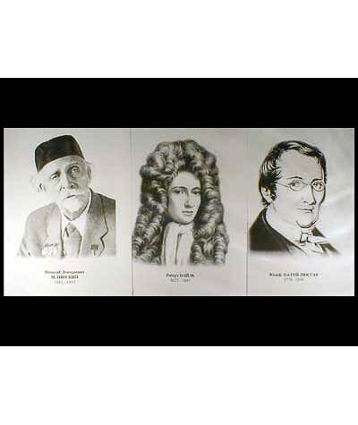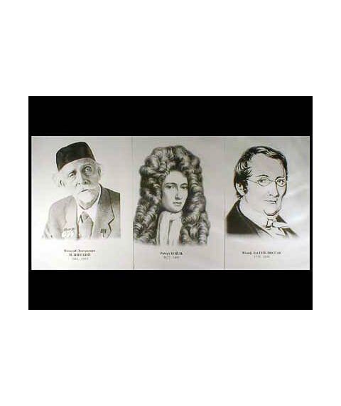 Представляют собой комплект портретов формата А3 в количестве 16шт., выполненных на качественной белой бумаге. На портретах указаны фамилии (с именами, либо с именами и отчествами) и даты жизни ученых.