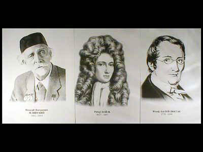 Представляют собой комплект портретов формата А3 в количестве 16шт., выполненных на качественной белой бумаге. На портретах указаны фамилии (с именами, либо с именами и отчествами) и даты жизни ученых.