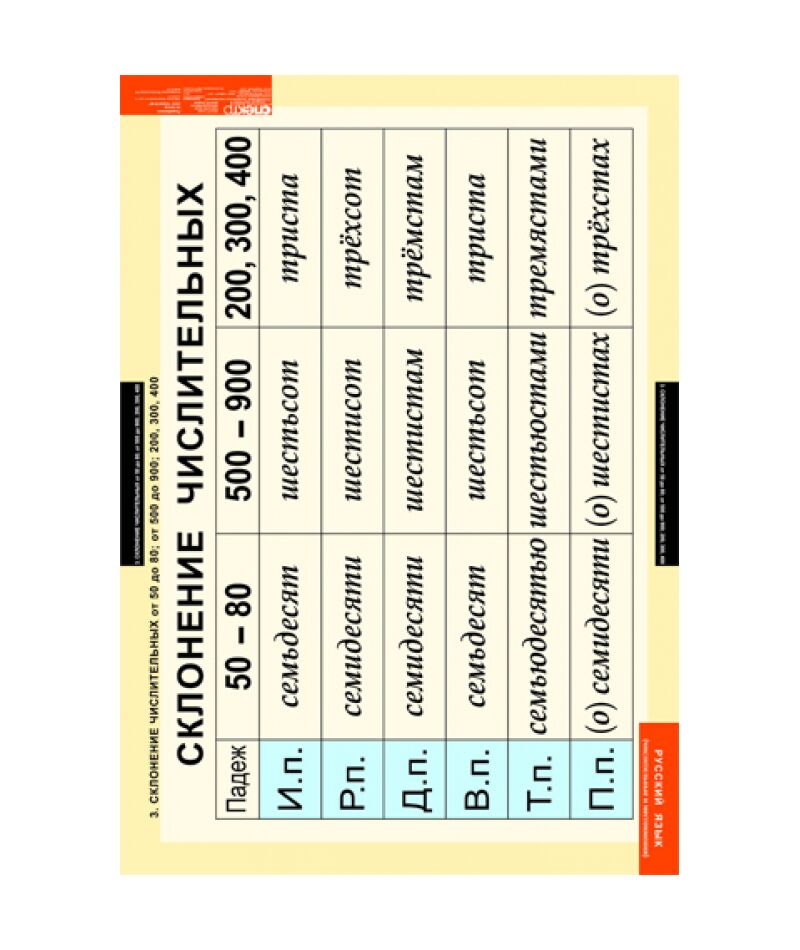 - Склонение числительных от 50 до 80, от 500 до 800, 200, 300, 400.
