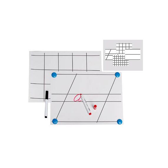 Таблицы напечатаны на двух листах формата А3 (двусторонняя печать). В комплект входят следующие таблицы: таблица для демонстрации техники письма букв на узких линейках, таблица для демонстрации техники письма букв на широких линейках, таблица для демонстрации техники письма цифр в крупных клетках, таблица для демонстрации правильного оформления математических записей. Таблицы ламинированы глянцевой пленкой, применяются по принципу "пиши–стирай". Используется маркер для белых досок. Написанное стирается сухой тряпкой.