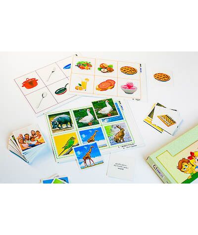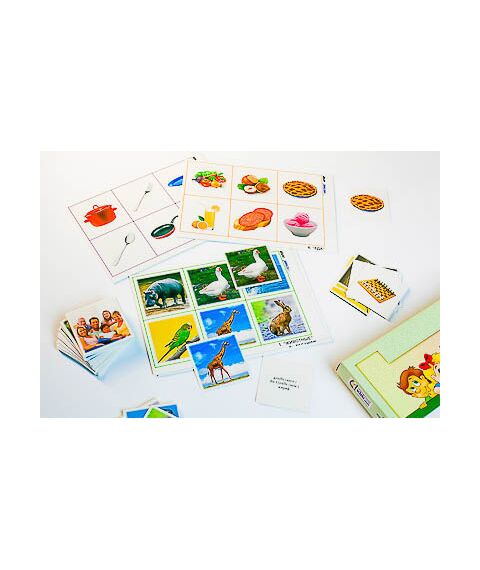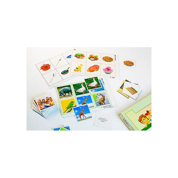 Комплектность: планшеты с изображениями – 6 шт., карточки с изображениями и подписями – 36 шт. (на обратной стороне каждой разрезной картинки приведено ее название на английском, немецком и русском языках), методические рекомендации с правилами игры – 1 шт.