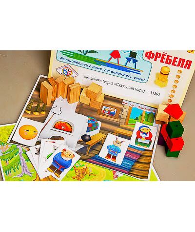 Игровой набор разработан в соответствии с педагогическими принципами Фребель-педагогики и представляет собой специально составленные комплекты из элементов «Даров Фребеля» с авторскими иллюстрациями по мотивам русских народных сказок. Карточки изготовлены из мелованной бумаги, ламинированной пленкой. Печать полноцветная. Элементы для игры изготовлены из дерева и пластика и упакованы в зип-пакеты.
