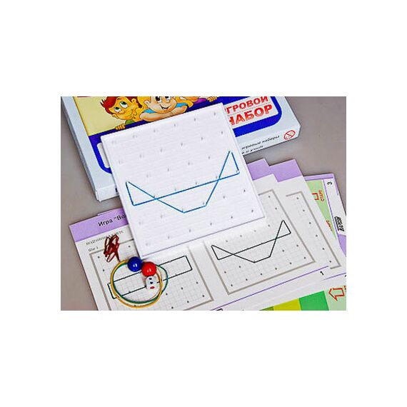 Игровой набор представляет собой пластиковый планшет размером 18*18 см, на одну сторону которого нанесена сетка из выступающих колышков шагом в 3 см, на другую – окружность диаметром 15 см и шагом в 2 см. Колышки предназначены для цепляния за них входящих в набор резинок с целью создания изображений. Набор комплектуется резинками трех диаметров, что позволяет выполнять "ходы" в шаг, два и более. Опорные карточки изготовлены из картона и ламинированы пленкой, на них даны примеры ходов в разных играх, приведены образцы фигур, которые необходимо скопировать, дорисовать или дополнить. Кубик игральный выполнен из пластика. Фишки изготовлены из пластика, окрашены в разные цвета.