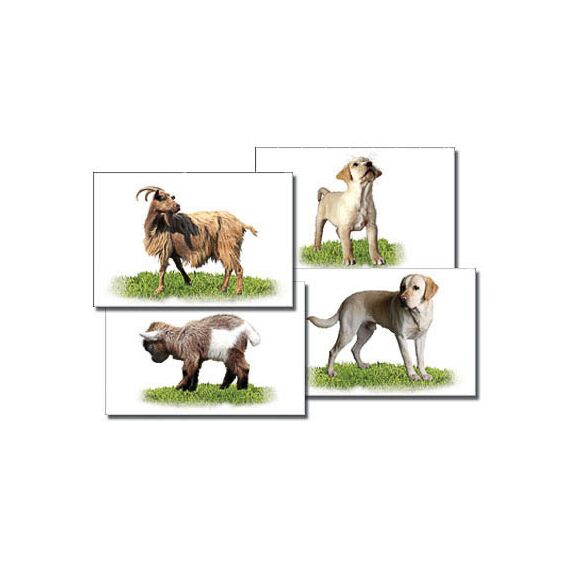 Комплектность: 7 пар карточек 10×15 см с фотографиями взрослых животных и их детенышей. На карточках изображены корова, теленок, овца, ягненок, свинья, поросенок, коза, козленок, лошадь, жеребенок, собака, щенок, кошка, котенок.