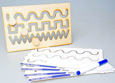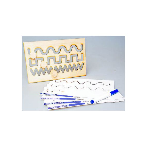 Деревянный планшет имеет фигурные прорези и работает по принципу лабиринта. Карточки-схемы повторяют рисунок прорезей на деревянном планшете и также, как и планшет, служат тренажером для развития мелкой моторики и подготовки руки ребенка к письму. Карточки-схемы формата А4 изготовлены из картона, ламинированы пленкой, что позволяет писать на них маркером для белых досок. Написанное легко стирается сухой тряпкой.