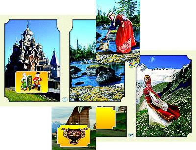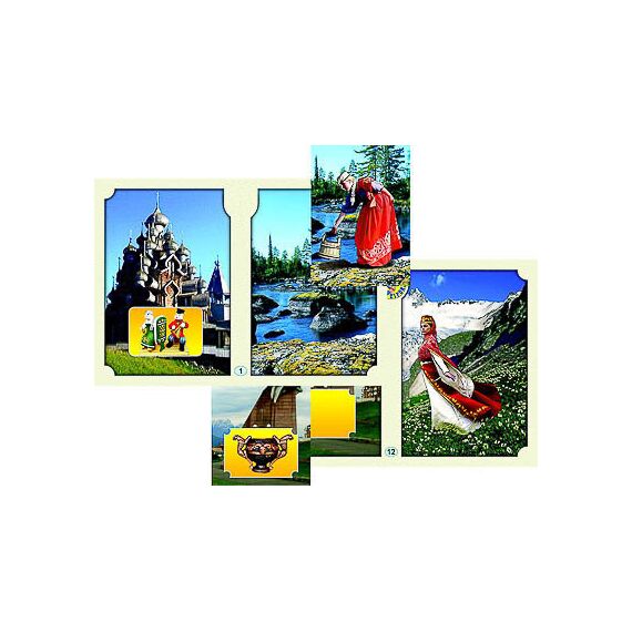 Каждое игровое поле посвящено одному региону России. На карточках изображены женщины в национальных костюмах и памятники архитектуры, характерные для определенного этноса России; они служат продолжением изображений на игровых полях и содержат общие с ним детали фона. На карточках с изображением зданий (сооружений) дана врезка, на которой представлены предметы декоративно-прикладного искусства, являющиеся визитной карточкой данного народа.