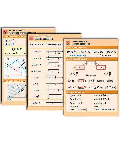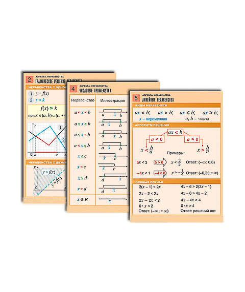 Комплект учебно-наглядных пособий формата А1 с полноцветной двухсторонней печатью и матовой двухсторонней ламинацией в количестве 8 таблиц: Числовые неравенства и их свойства. Графическое решение неравенств. Двойное неравенство. Числовые промежутки. Линейные неравенства. Системы линейных неравенств. Квадратные неравенства. Дробно-рациональные неравенства.