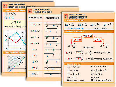 Комплект учебно-наглядных пособий формата А1 с полноцветной двухсторонней печатью и матовой двухсторонней ламинацией в количестве 8 таблиц: Числовые неравенства и их свойства. Графическое решение неравенств. Двойное неравенство. Числовые промежутки. Линейные неравенства. Системы линейных неравенств. Квадратные неравенства. Дробно-рациональные неравенства.