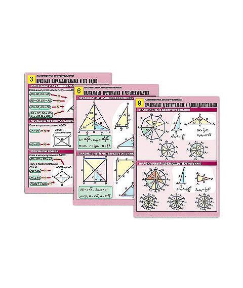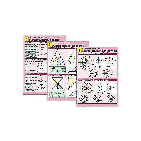 Комплект учебно-наглядных пособий формата А1 с полноцветной двухсторонней печатью и матовой двухсторонней ламинацией в количестве 10 таблиц: 1. Свойства параллелограммов. 2. Трапеция. 3. Признаки параллелограмма и его видов. 4. Свойства многоугольников. 5. Теорема Фалеса. 6. Правильные треугольник и четырехугольник. 7. Правильные шестиугольник и восьмиугольник. 8. Площадь многоугольника (1). 9. Правильные девятиугольник и двенадцатиугольник. 10. Площадь многоугольника (2).
