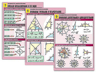 Комплект учебно-наглядных пособий формата А1 с полноцветной двухсторонней печатью и матовой двухсторонней ламинацией в количестве 10 таблиц: 1. Свойства параллелограммов. 2. Трапеция. 3. Признаки параллелограмма и его видов. 4. Свойства многоугольников. 5. Теорема Фалеса. 6. Правильные треугольник и четырехугольник. 7. Правильные шестиугольник и восьмиугольник. 8. Площадь многоугольника (1). 9. Правильные девятиугольник и двенадцатиугольник. 10. Площадь многоугольника (2).