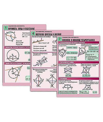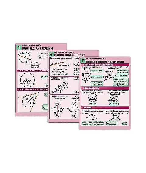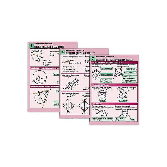 Комплект учебно-наглядных пособий формата А1 с полноцветной двухсторонней печатью и матовой двухсторонней ламинацией в количестве 8 таблиц: 1. Окружность. Хорды и касательные. 2. Окружность, описанная около треугольника. 3. Окружность, вписанная в треугольник. 4. Построения циркулем и линейкой. 5. Центральные и вписанные углы. 6. Свойства хорд и секущих. 7. Вписанные и описанные четырехугольники. 8. Длина окружности и площадь круга.
