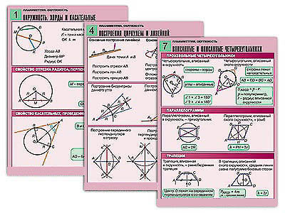 Комплект учебно-наглядных пособий формата А1 с полноцветной двухсторонней печатью и матовой двухсторонней ламинацией в количестве 8 таблиц: 1. Окружность. Хорды и касательные. 2. Окружность, описанная около треугольника. 3. Окружность, вписанная в треугольник. 4. Построения циркулем и линейкой. 5. Центральные и вписанные углы. 6. Свойства хорд и секущих. 7. Вписанные и описанные четырехугольники. 8. Длина окружности и площадь круга.