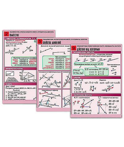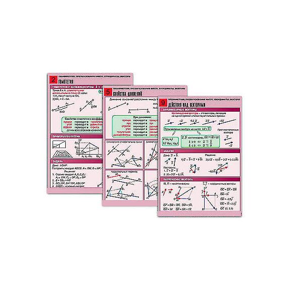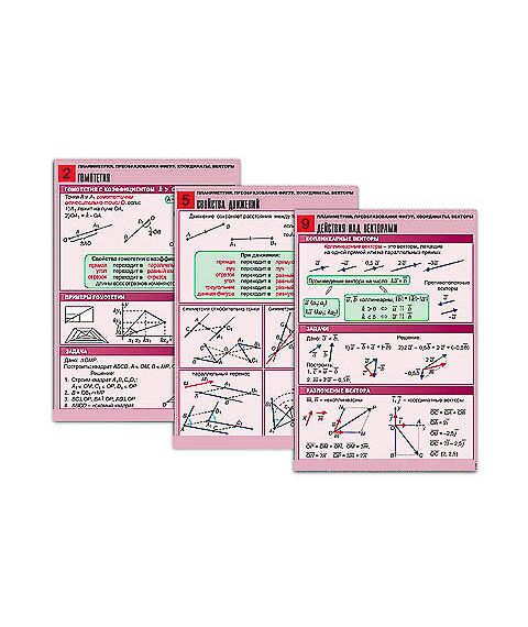 Комплект учебно-наглядных пособий формата А1 с полноцветной двухсторонней печатью и матовой двухсторонней ламинацией в количестве 10 таблиц: 1. Симметрии. 2. Гомотетия. 3. Параллельный перенос и поворот. 4. Декартовы координаты на плоскости. 5. Свойства движений. 6. Уравнения окружности и прямой. 7. Синус, косинус и тангенс углов от 0° до 180°. 8. Векторы. Сумма векторов. 9. Действия над векторами. 10. Скалярное произведение векторов.