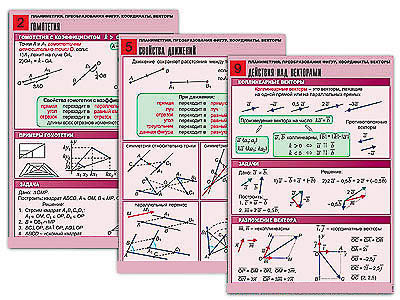 Комплект учебно-наглядных пособий формата А1 с полноцветной двухсторонней печатью и матовой двухсторонней ламинацией в количестве 10 таблиц: 1. Симметрии. 2. Гомотетия. 3. Параллельный перенос и поворот. 4. Декартовы координаты на плоскости. 5. Свойства движений. 6. Уравнения окружности и прямой. 7. Синус, косинус и тангенс углов от 0° до 180°. 8. Векторы. Сумма векторов. 9. Действия над векторами. 10. Скалярное произведение векторов.