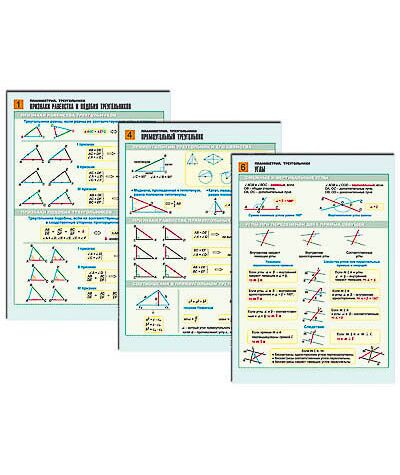 Пособие состоит из 6 полноцветных таблиц, ламинированных глянцевой пленкой: 1. Признаки равенства и подобия треугольников. 2. Произвольный треугольник. 3. Равнобедренный и равносторонний треугольники. 4. Прямоугольный треугольник. 5. Площадь треугольника. 6. Углы.