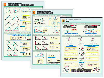Пособие состоит из 6 полноцветных таблиц, ламинированных глянцевой пленкой: 1. Признаки равенства и подобия треугольников. 2. Произвольный треугольник. 3. Равнобедренный и равносторонний треугольники. 4. Прямоугольный треугольник. 5. Площадь треугольника. 6. Углы.
