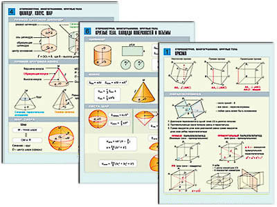 Описание Комплект таблиц по геометрии раздат. "Стереометрия. Многогранники. Круглые тела" (цвет, лам, 6 шт.)