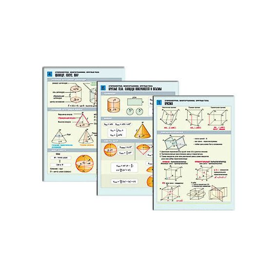 Пособие состоит из 6 полноцветных таблиц, ламинированных глянцевой пленкой: 1. Призма. 2. Пирамида. 3. Правильная пирамида. 4. Цилиндр. Конус. Шар. 5. Многогранники. Площади поверхностей и объемы. 6. Круглые тела. Площади поверхностей и объемы.