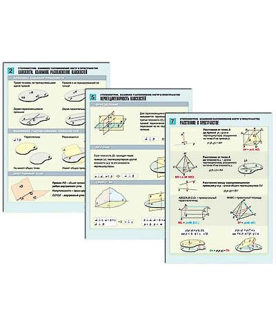Пособие состоит из 8 полноцветных таблиц, ламинированных глянцевой пленкой: 1. Прямые и плоскости в пространстве. 2. Плоскости. Взаимное расположение плоскостей. 3. Параллельность прямых и плоскостей. 4. Перпендикулярность прямой и плоскости. 5. Перпендикулярность плоскостей. 6. Изображение плоских фигур в параллельной проекции. 7. Расстояние в пространстве. 8. Углы в пространстве.