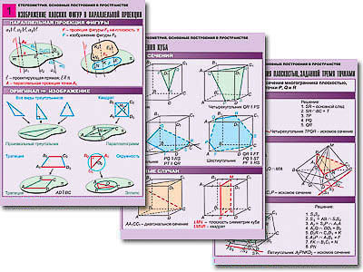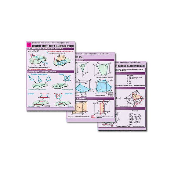 Комплект учебно-наглядных пособий формата А1 с полноцветной двухсторонней печатью и матовой двухсторонней ламинацией в количестве 8 таблиц: 1. Изображение плоских фигур в параллельной проекции. 2. Изображение призм и пирамид в параллельной проекции. 3. Построение точки пересечения прямой с плоскостью. 4. Построение линии пересечения двух плоскостей. 5. Построение основного следа секущей плоскости. 6. Построение сечения плоскостью, заданной тремя точками. 7. Сечения куба. 8. Построение прямой, перпендикулярной заданной прямой.