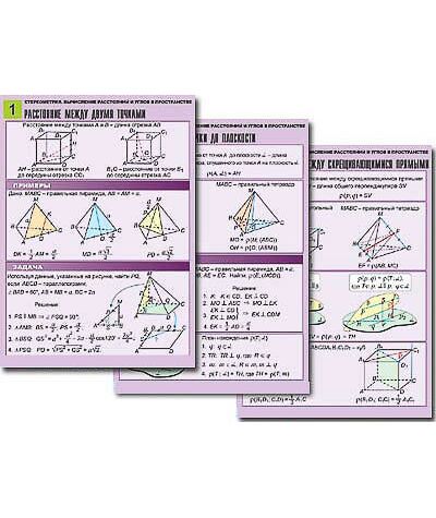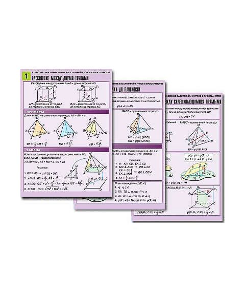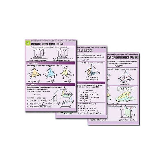 Комплект учебно-наглядных пособий формата А1 с полноцветной двухсторонней печатью и матовой двухсторонней ламинацией в количестве 8 таблиц: 1. Расстояние между двумя точками. 2. Расстояние от точки до прямой. 3. Расстояние от точки до плоскости. 4. Расстояние между скрещивающимися прямыми. 5. Угол между скрещивающимися прямыми. 6. Угол между прямой и плоскостью. 7. Двугранные углы. 8. Угол между двумя плоскостями.
