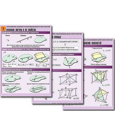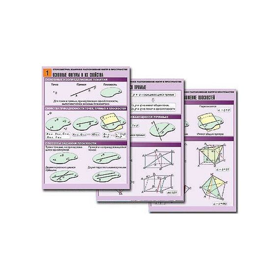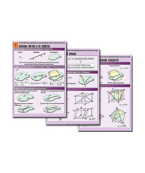 Комплект учебно-наглядных пособий формата А1 с полноцветной двухсторонней печатью и матовой двухсторонней ламинацией в количестве 8 таблиц: 1. Основные фигуры и их свойства. 2. Взаимное расположение прямых в пространстве. 3. Скрещивающиеся прямые. 4. Взаимное расположение прямой и плоскости. 5. Перпендикулярность прямых и плоскостей. 6. Параллельность прямых и плоскостей. 7. Взаимное расположение плоскостей. 8. Теорема о трех перпендикулярах.