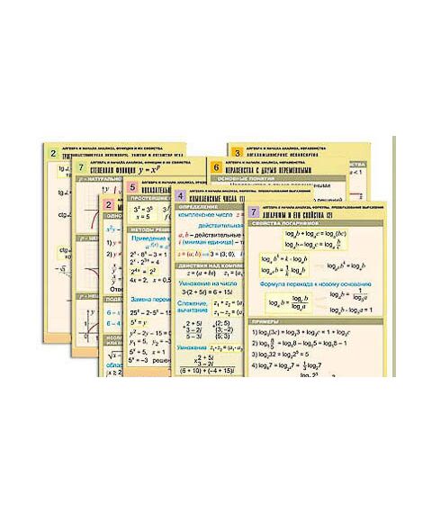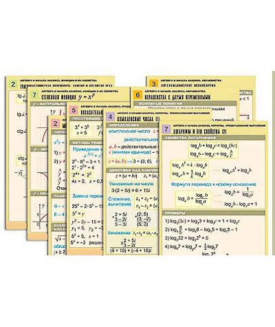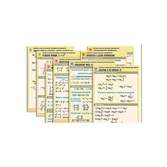 Описание Комплект таблиц по всему курсу "Алгебра и начала анализа" (50 табл., А1, полноцв., лам.)