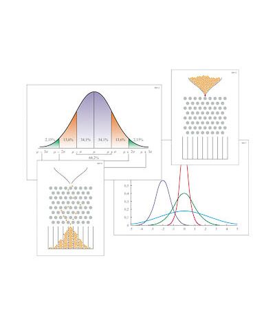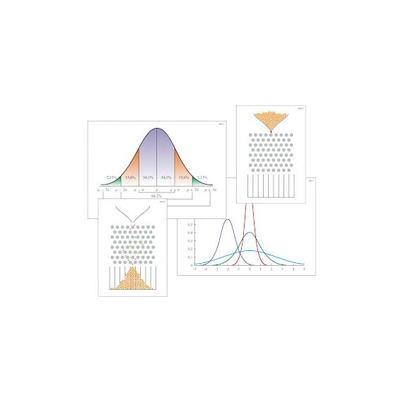 Комплектность: карточка с изображением оси координат функции f(x) (0–0,4) – 1 шт., карточки с изображением столбцов гистограммы – 8 шт., карточка с функцией плотности нормального распределения – 1 шт., карточка с изображением графиков нормального распределения с различными величинами переменных – 1 шт., карточка с изображением кривой Гаусса, с секторами – 1 шт., карточки с изображением доски Гальтона – 3 шт., карточка с графическим изображением случайной переменной отклонения – 1 шт., карточка с примером расчета вероятности и плотности нормального распределения – 1 шт., карточка с таблицей стандартного нормального распределения – 1 шт. (общее количество карточек: 18 шт.), руководство по эксплуатации с методическими рекомендациями – 1 шт.