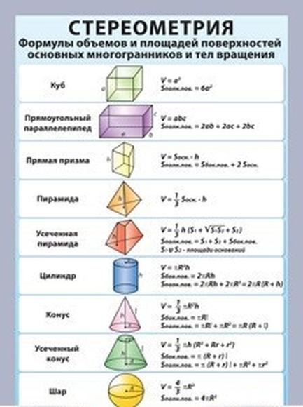 Стереометрия. Формулы объемов и площадей поверхностей основных многогранников и тел вращения (винил)