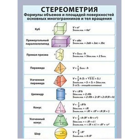 Наличие товара Стереометрия. Формулы объемов и площадей поверхностей основных многогранников и тел вращения (винил)
