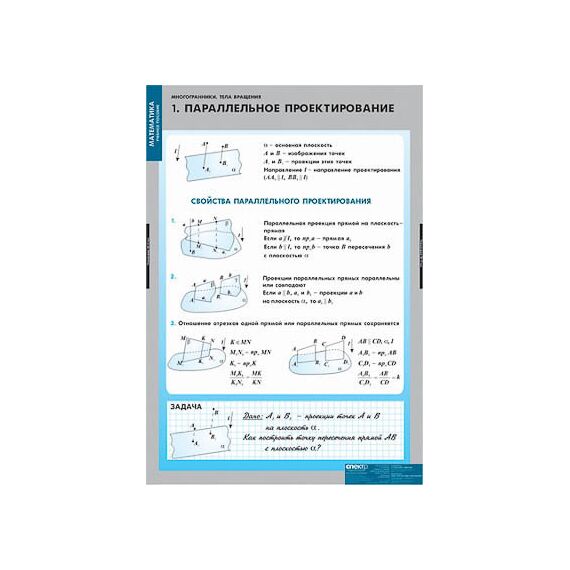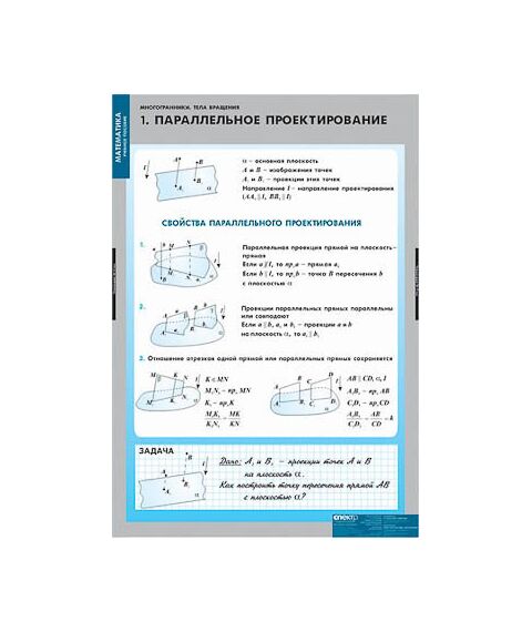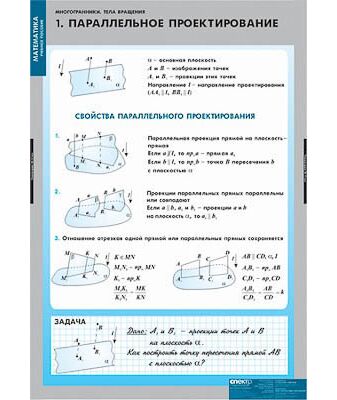 Параллельное проектирование. Изображение плоских фигур. Поэтапное иллюстрирование доказательства теорем. Взаимное расположение прямых и плоскостей. Правильные многогранники. Изображение многогранников. Круглые тела. (тела вращения). Вписанный и описанный шары. Построение точки встречи (следа) прямой с плоскостью. Построение сечений. Иллюстрации к нетипичным стереометрическим ситуациям.