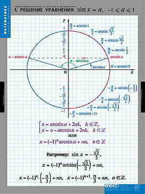 Учебный альбом из 7 листов, формат 68*98 см.Решение уравнения sin x=a. Решение уравнения сos x=a. Решение уравнения tg x=a. Решение уравнения ctg x=a. Решение неравенства сos x < a. Решение неравенства tg x < a. Решение неравенства ctg x > a.