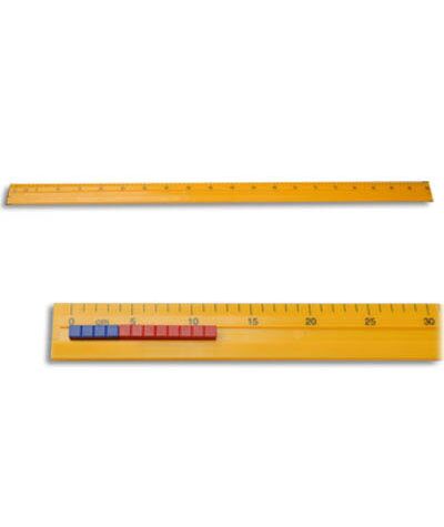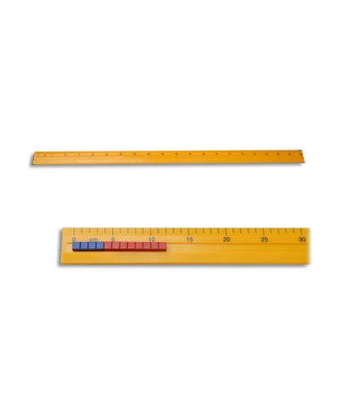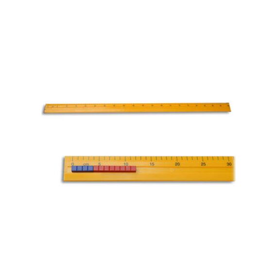 Линейка размером 103*5 см изготовлена из пластика. Вдоль линейки сделан желоб шириной 11 мм для выкладывания счетных элементов. С левой стороны желоба установлен ограничитель. Над желобом нанесена сантиметровая разметка с оцифровкой через пять сантиметров.