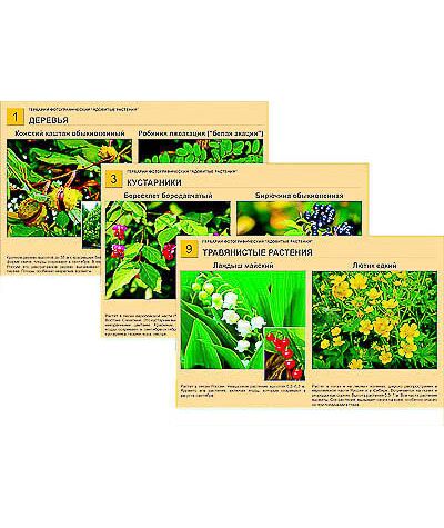Пособие состоит из 9 полноцветных листов, напечатанных на картоне и ламинированных пленкой. В пособии представлены фотографии 18 видов ядовитых растений, наиболее распространенных на территории России.