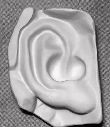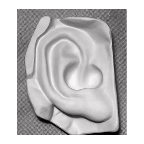Представляет собой увеличенную модель человеческого уха с петлей для крепления на классной доске. Модель выполнена из гипса, не окрашена.