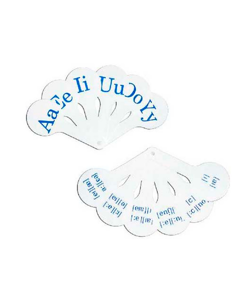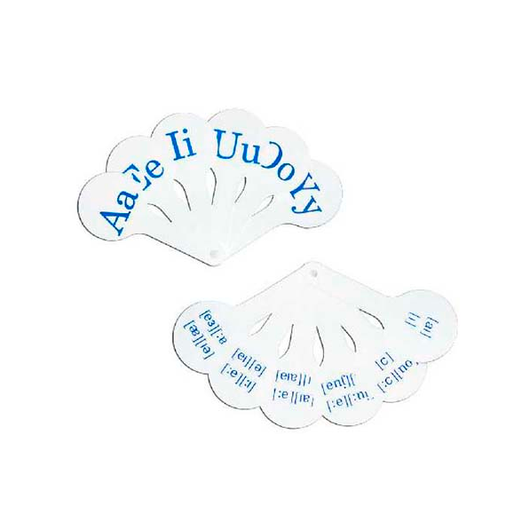 Изготовлена из пластмассы. Представляет собой комплект пластинок, соединенных аналогично соединению деталей веера, с буквами, обозначающими гласные звуки английского языка. Буквы выполнены крупным шрифтом и нанесены яркой краской.