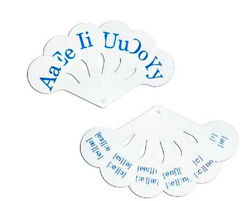 Изготовлена из пластмассы. Представляет собой комплект пластинок, соединенных аналогично соединению деталей веера, с буквами, обозначающими гласные звуки английского языка. Буквы выполнены крупным шрифтом и нанесены яркой краской.