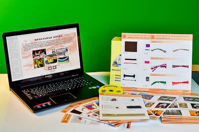 Пособие состоит из 5 полноцветных листов формата А4, напечатанных на картоне и ламинированных глянцевой пленкой. В коллекции представлены: классификация сырья для производства тканей, образцы натуральных и химических тканей, нитки различного назначения и швейная фурнитура.