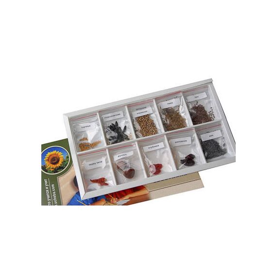 В пособии представлены засушенные плоды сельскохозяйственных растений. Образцы расфасованы в пакеты и снабжены этикетками с названиями растений.