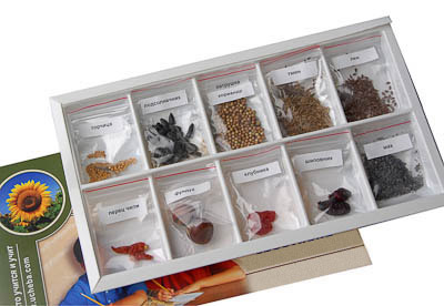 В пособии представлены засушенные плоды сельскохозяйственных растений. Образцы расфасованы в пакеты и снабжены этикетками с названиями растений.
