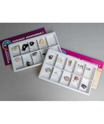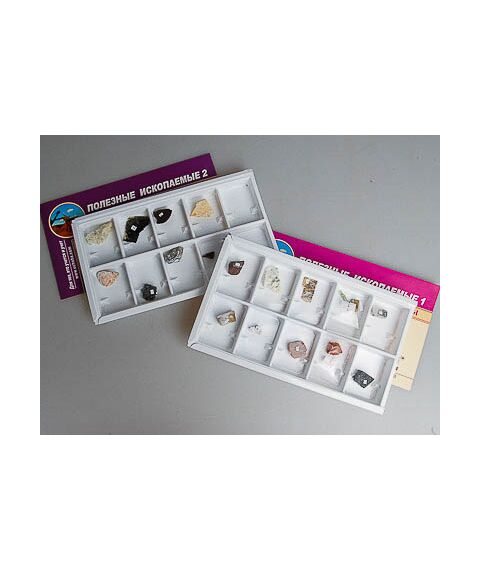 Образцы пронумерованы соответственно списку и разложены в две коробки с ячейками. Пособие комплектуется руководством по эксплуатации и ламинированным вкладышем, содержащим информацию о внешнем виде, месторождениях и применении полезных ископаемых.