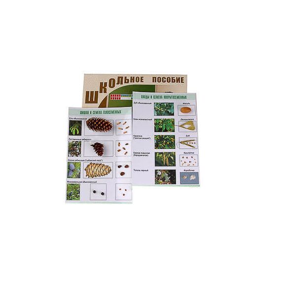 В коллекции представлены шишки, плоды и семена хвойных и покрытосеменных растений. Натуральные образцы сопровождаются фотографиями растений. Планшеты формата А4 изготовлены из картона и ламинированы глянцевой пленкой.