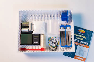 Состав комплекта: весы электронные - 1 шт., измерительный цилиндр стеклянный (мензурка), предел измерения 250 мл (цена деления 2 мл) - 1 шт., стакан пластиковый с носиком (250 мл) - 1 шт., динамометр № 1 планшетный, предел измерения 1 Н (цена деления 0,02 Н) - 1 шт., динамометр № 2 планшетный, предел измерения 5 Н (цена деления 0,1 Н) - 1 шт., поваренная соль - 1 уп., палочка для перемешивания пластиковая - 1 шт., цилиндр стальной на нити №1, V = (25,0±0,3) см3, высота 40 мм, m = (195±2) г - 1 шт., цилиндр алюминиевый на нити №2, V = (25,0±0,7) см3, высота 40 мм, m = (70±2) г - 1 шт., цилиндр пластиковый на нити №3 со шкалой длиной 80 мм с ценой деления 1 мм, V = (56,0±1,8) см3, m = (66±2) г - 1 шт., цилиндр алюминиевый №4 , V = (34,0±0,7) см3, высота 50 мм, m = (95±2) г - 1 шт., нить 50 см - 4 шт., лоток пластиковый размером 340*270*55 мм - 1 шт., учебное пособие «Лабораторные наборы по курсу физики» (автор Е.Ю. Косарева – 68 страниц – печать офсетная, обложка полноцветная) – 1 шт., руководство по эксплуатации - 1 шт.