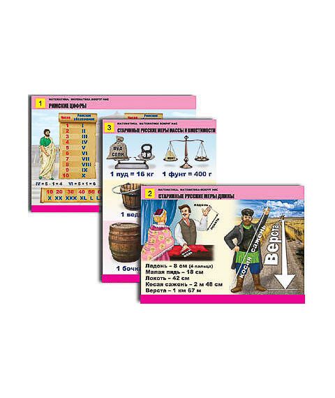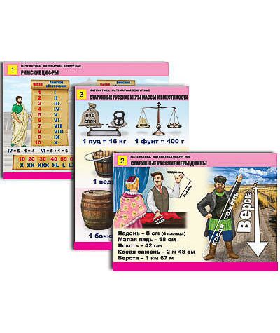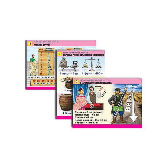 Таблицы: 1. Римские цифры. 2. Старинные русские меры длины. 3. Старинные русские меры массы и вместимости. 4. Математика и мир вокруг (1). 5. Математика и мир вокруг (2). 6. Геометрические узоры. Симметрия. 7. Плоские и объемные фигуры. 8. Куб. Прямоугольный параллелепипед. 9. Поиск треугольников в заданной фигуре. 10. Геометрия и мир вокруг.