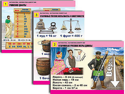 Таблицы: 1. Римские цифры. 2. Старинные русские меры длины. 3. Старинные русские меры массы и вместимости. 4. Математика и мир вокруг (1). 5. Математика и мир вокруг (2). 6. Геометрические узоры. Симметрия. 7. Плоские и объемные фигуры. 8. Куб. Прямоугольный параллелепипед. 9. Поиск треугольников в заданной фигуре. 10. Геометрия и мир вокруг.