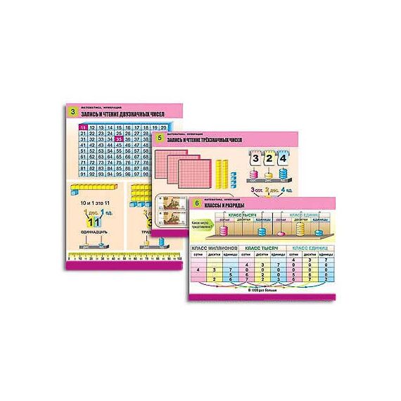 Таблицы: 1. Нумерация чисел в пределах 10. 2. Десяток. Счёт десятками. 3. Запись и чтение двузначных чисел. 4. Сотня. Счёт сотнями. Запись и название "круглых" сотен. 5. Запись и чтение трёхзначных чисел. 6. Классы и разряды. 7. Представление числа в виде суммы разрядных слагаемых. 8. Сравнение многозначных чисел.